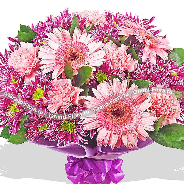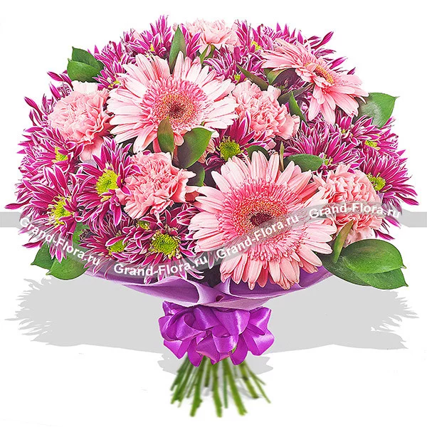 ДЕЛЮКС: гербера розовая - 9 шт., гвоздика одноголовая розовая - 14 шт., хризантема кустовая  фиолетовая - 10 шт., рускус, фетр фиолетовый.